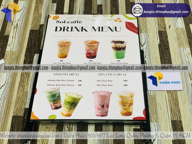 Xưởng Thiên Phúc không chỉ chuyên sản xuất Biển hiệu in 1 mặt chân sắt di động để ngoài trời, mà còn cung cấp và gia công nhiều loại bảng standee khác, phục vụ đa dạng nhu cầu cửa hàng, công ty, gian hàng triển lãm, hội chợ. Dưới đây là các mẫu tiêu biểu: