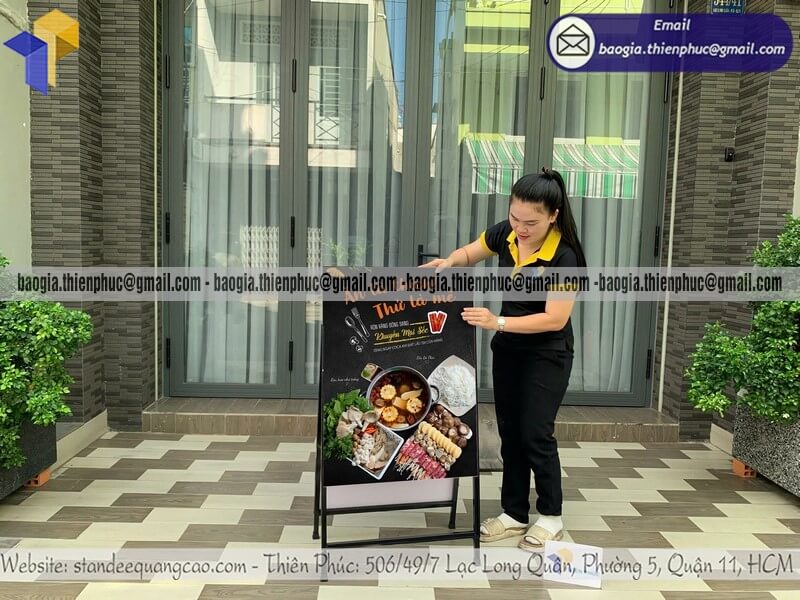 Biển quảng cáo chữ A chịu gió khung sắt in hai mặt - Xưởng sản xuất & Công Ty Thiên Phúc chuyên nhận thiết kế và in ấn logo thương hiệu theo yêu cầu khách hàng. Chuyên nhận đặt làm nhiều kích thước - cung cấp - sản xuất - gia công nhiều mẫu bảng standee quảng cáo in 1 mặt/2 mặt đặt trước cửa hàng, bán trên vỉa hè. Tại xưởng, giá standee chữ A chân sắt in logo 2 mặt quảng cáo dao động chỉ từ 500.000đ/cái - trên 1.000.000đ/cái trở lên. Tùy thuộc vào kích thước và số lượng đặt hàng. Hỗ trợ xuất hóa đơn VAT nhanh chóng cho doanh nghiệp. Liên hệ ngay với chúng tôi - xưởng sản xuất Thiên Phúc để nhận được báo giá và đặt hàng nhanh chóng ngay hôm nay. Giao hàng nhanh trên toàn quốc. Đặt từ 10 cái trở lên sẽ nhận được chiết khấu ưu đãi nhất với giá sỉ.