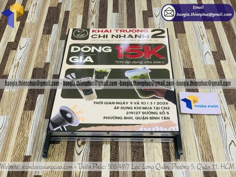 Khung bảng hiệu chữ A quảng cáo in 2 mặt ngoài trời - Xưởng sản xuất & Công Ty Thiên Phúc chuyên nhận thiết kế và in ấn logo thương hiệu theo yêu cầu khách hàng. Chuyên nhận đặt làm nhiều kích thước - cung cấp - sản xuất - gia công nhiều mẫu bảng standee quảng cáo in 1 mặt/2 mặt đặt trước cửa hàng, bán trên vỉa hè. Tại xưởng, giá standee chữ A chân sắt in logo 2 mặt quảng cáo dao động chỉ từ 500.000đ/cái - 800.000đ/cái trở lên. Tùy thuộc vào kích thước và số lượng đặt hàng. Hỗ trợ xuất hóa đơn VAT nhanh chóng cho doanh nghiệp. Liên hệ ngay với chúng tôi - xưởng sản xuất Thiên Phúc để nhận được báo giá và đặt hàng nhanh chóng ngay hôm nay. Giao hàng nhanh trên toàn quốc. Đặt từ 10 cái trở lên sẽ nhận được chiết khấu ưu đãi nhất với giá sỉ.