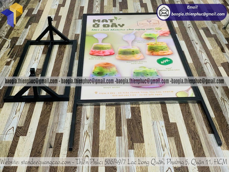 Mua bảng standee quảng cáo sản phẩm đứng ngoài trời - Xưởng sản xuất & Công Ty Thiên Phúc chuyên nhận gia công - cung cấp - sản xuất - thiết kế và in ấn logo thương hiệu, nhãn hiệu, menu sản phẩm. Nhiều mẫu bảng standee đứng 2 mặt quảng cáo bằng khung sắt với giá rẻ cạnh tranh nhất thị trường, không qua trung gian dao động chỉ với trên 800.000đ/cái trở lên. Hỗ trợ thiết kế logo thương hiệu theo yêu cầu. Đặt hàng số lượng lớn từ 10 cái trở lên được chiết khấu ưu đãi với giá sỉ. Nhận làm hàng nhanh giao gấp trong vòng 1-2 ngày. Hãy liên hệ ngay xưởng sản xuất Thiên Phúc để nhận được thông tin báo giá chi tiết nhất và đặt hàng nhanh chóng ngay hôm nay.