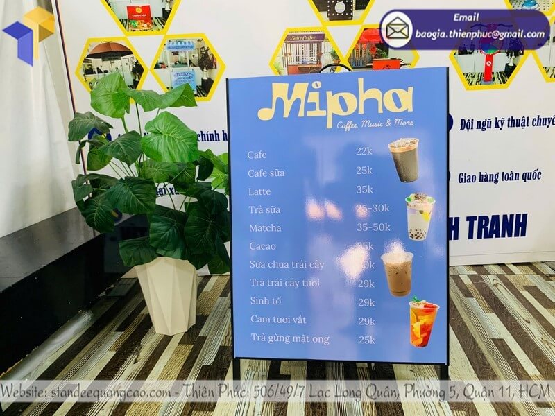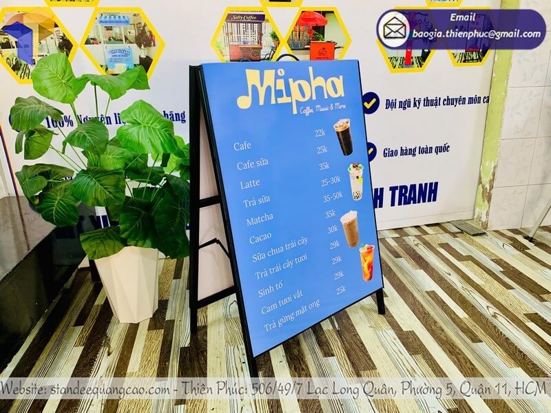 - Bảng A mini (60x80cm) – Gọn nhẹ, phù hợp cho các gian hàng nhỏ, quán nước, tiệm tóc, spa mini.