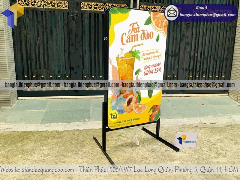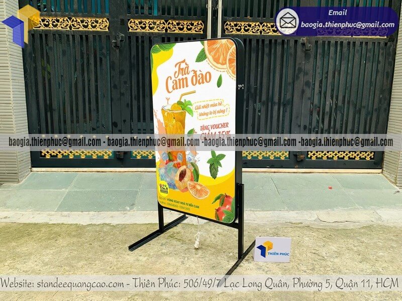 Tên sản phẩm: Bảng hiệu hộp đèn mica quảng cáo đứng trên vỉa hè với logo bán TRÀ CAM ĐÀO