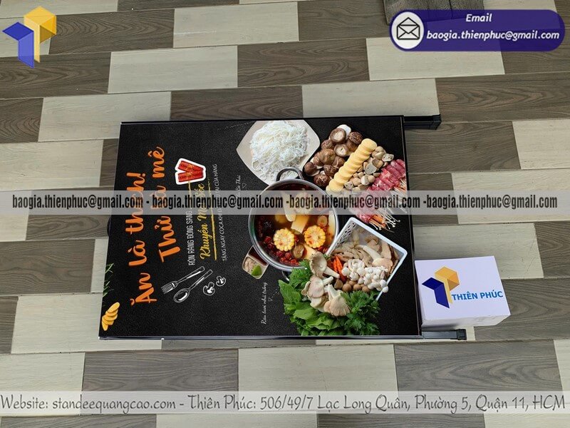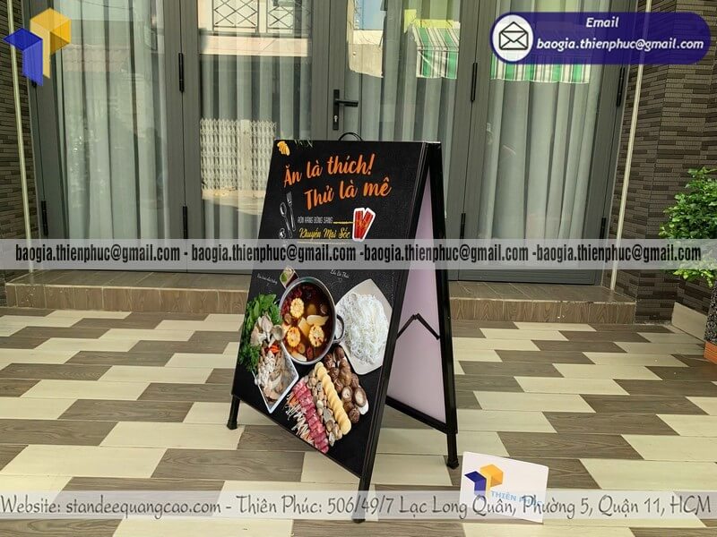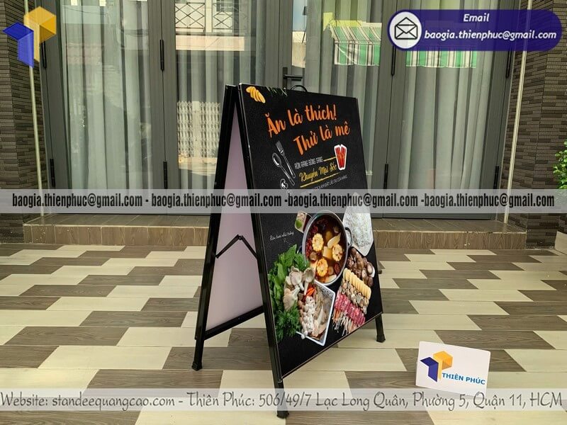 Biển quảng cáo chữ A chịu gió khung sắt in hai mặt - Xưởng sản xuất & Công Ty Thiên Phúc chuyên nhận thiết kế và in ấn logo thương hiệu theo yêu cầu khách hàng. Chuyên nhận đặt làm nhiều kích thước - cung cấp - sản xuất - gia công nhiều mẫu bảng standee quảng cáo in 1 mặt/2 mặt đặt trước cửa hàng, bán trên vỉa hè. Tại xưởng, giá standee chữ A chân sắt in logo 2 mặt quảng cáo dao động chỉ từ 500.000đ/cái - trên 1.000.000đ/cái trở lên. Tùy thuộc vào kích thước và số lượng đặt hàng. Hỗ trợ xuất hóa đơn VAT nhanh chóng cho doanh nghiệp. Liên hệ ngay với chúng tôi - xưởng sản xuất Thiên Phúc để nhận được báo giá và đặt hàng nhanh chóng ngay hôm nay. Giao hàng nhanh trên toàn quốc. Đặt từ 10 cái trở lên sẽ nhận được chiết khấu ưu đãi nhất với giá sỉ.