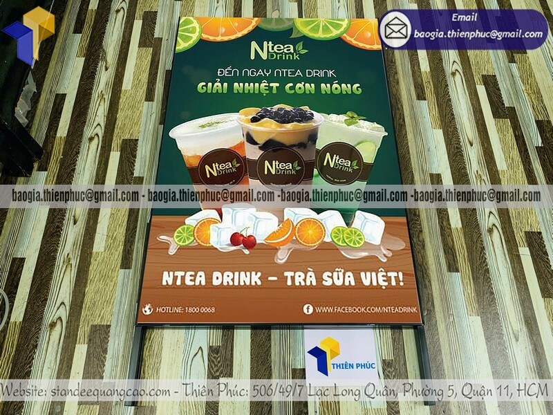In bảng standee quảng cáo ngoài trời 2 mặt chữ A chân sắt - Xưởng sản xuất Thiên Phúc chuyên nhận sản xuất - gia công nhiều bảng standee A in 1 mặt 2 mặt decal với thiết kế logo thương hiệu nhãn hiệu theo yêu cầu khách hàng. Hỗ trợ xuất hóa đơn VAT cho doanh nghiệp, công ty nhanh chóng. Đặt hàng từ 10 cái trở lên được giảm giá chiết khấu giá sỉ . Giá rẻ nhất dao động chỉ từ 500.000đ/cái trở lên. Nhận làm cho đơn hàng gấp sự kiện từ 1-2 ngày giao nhanh trên toàn quốc.
