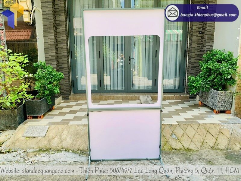 - Khung chụp hình check-in quảng cáo: Thiết kế nhỏ gọn, dễ di chuyển, phù hợp booth, quầy bán hàng và sự kiện ngoài trời.