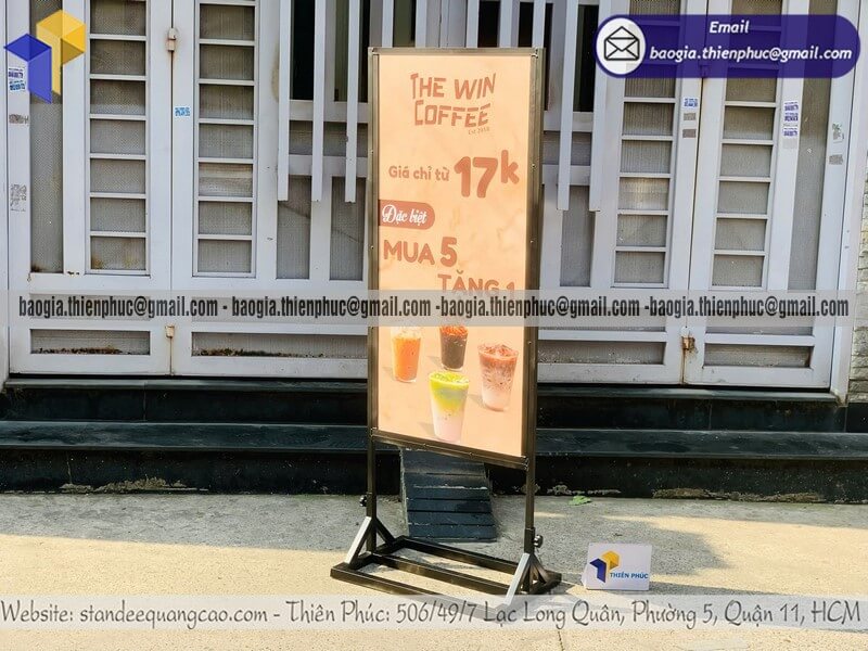 Mua standee quảng cáo khung sắt đứng chịu gió ngoài trời - Xưởng sản xuất & Công Ty Thiên Phúc chuyên nhận gia công - cung cấp - sản xuất - thiết kế và in ấn logo thương hiệu, nhãn hiệu, menu sản phẩm. Nhiều mẫu bảng standee đứng 2 mặt quảng cáo bằng khung sắt với giá rẻ cạnh tranh nhất thị trường, không qua trung gian dao động chỉ với trên 800.000đ/cái trở lên. Hỗ trợ thiết kế logo thương hiệu theo yêu cầu. Đặt hàng số lượng lớn từ 10 cái trở lên được chiết khấu ưu đãi với giá sỉ. Nhận làm hàng nhanh giao gấp trong vòng 1-2 ngày. Hãy liên hệ ngay xưởng sản xuất Thiên Phúc để nhận được thông tin báo giá chi tiết nhất và đặt hàng nhanh chóng ngay hôm nay.