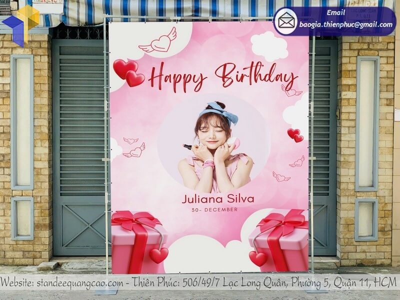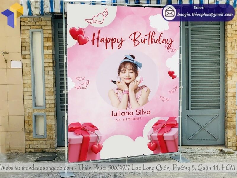 Thiết kế backdrop di động ngoài trời sự kiện sinh nhật - Xưởng sản xuất Thiên Phúc chuyên nhận sản xuất - gia công - cung cấp - thiết kế và in ấn backdrop cho các sự kiện ngoài trời. Với giá rẻ nhất chỉ từ 1.800.000đ/cái trở lên (chưa ba chi phí thay bạt). Hỗ trợ xuất hóa đơn VAT cho Doanh Nghiệp - Công Ty. Sản xuất & Giao hàng nhanh chóng đối với đơn hàng số lượng lớn từ 20 cái trở lên từ 4-7 ngày. Giao hàng tận nơi trên toàn quốc. Liên hệ ngay để được chúng tôi báo giá chi tiết và đặt hàng nhanh chóng chính xác. Đặt cọc trước 50% đơn hàng để nhận thiết kế demo