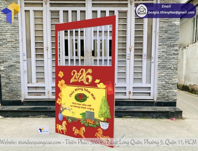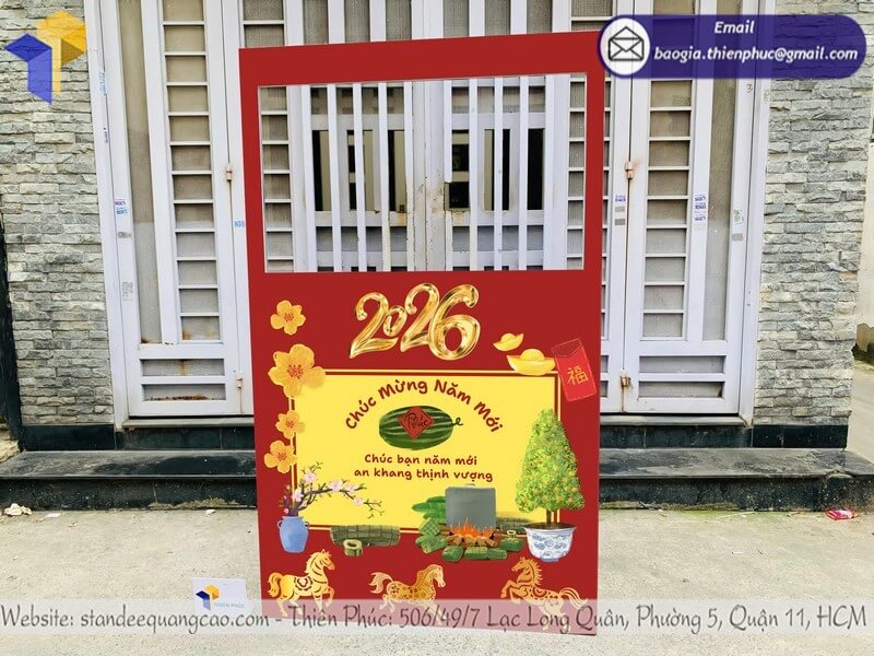 Giá sản phẩm dao động linh hoạt, chỉ từ 1.400.000 VNĐ – 2.600.000 VNĐ/cái trở lên, tùy vào kích thước và mức độ gia công họa tiết. Mức giá này đã bao gồm chi phí thiết kế cơ bản, cắt, uốn formex, in decal hoặc in trực tiếp hình ảnh Tết, giúp khách hàng dễ dàng dự trù ngân sách cho không gian check-in ấn tượng.